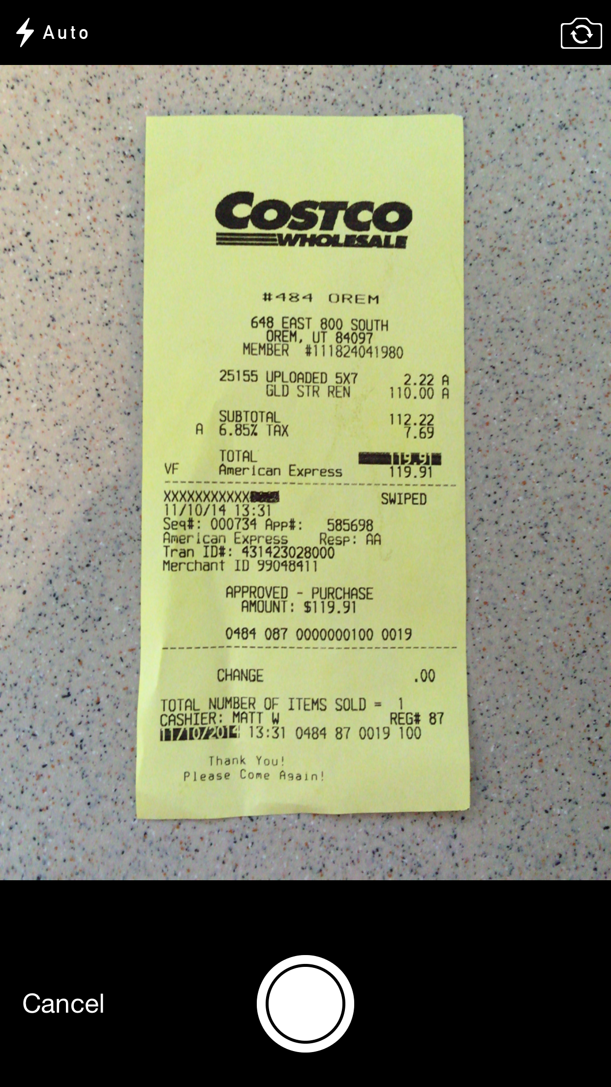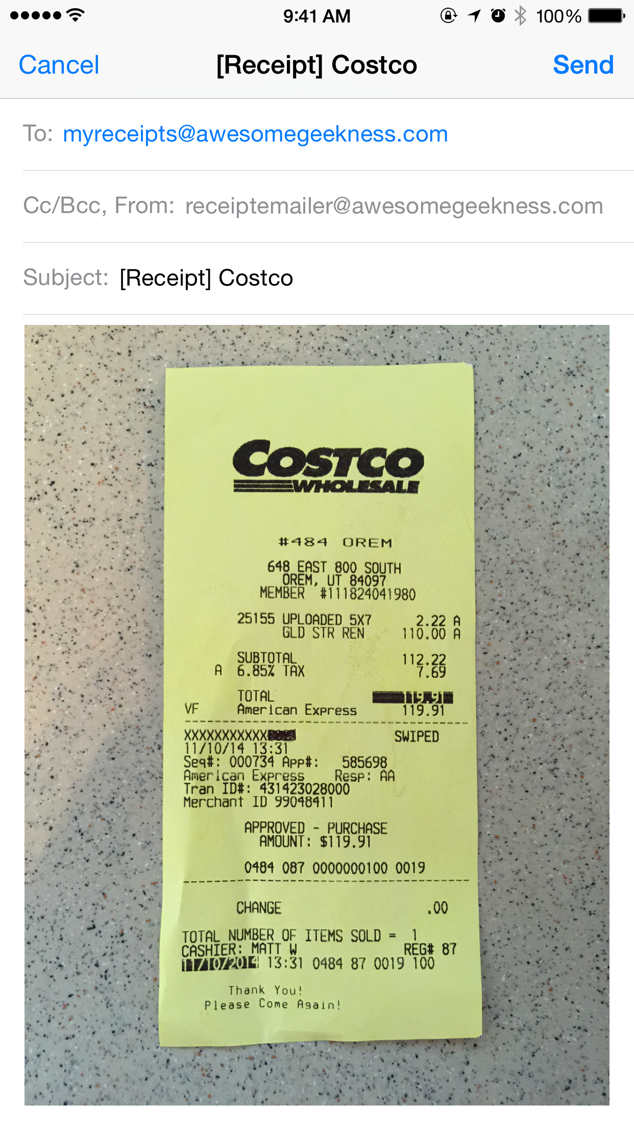 Every day we expense our lunch on the company. Rather than save all those receipts, we just take a photo of our receipt and email it to ourselves. It wasn't a ton of work, but it happened often enough, we decided to stream-line the process.